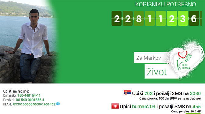 1.652 Upišimo 203 i pošaljimo SMS na 3030. Humanitarna fondacija BUDI HUMAN – Aleksandar Šapić prikuplja novčana sredstva za lečenje Marka Markovića (28) iz Ivanjice.